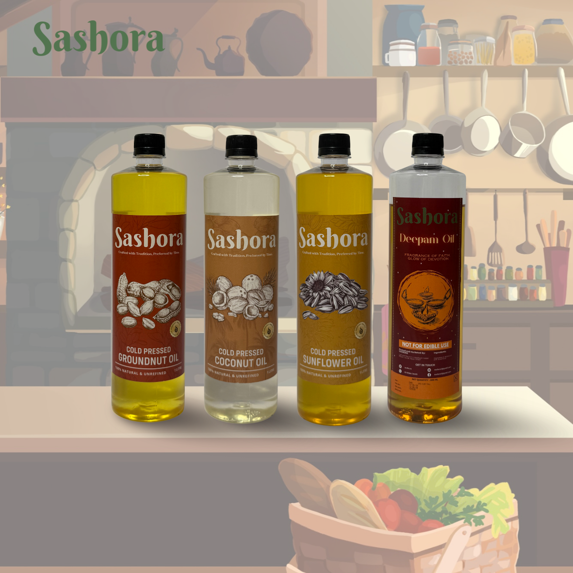 A powerhouse combo of purity and versatility. This bundle includes four of our finest oils — Sunflower, Groundnut, Coconut & Deepam — perfect for cooking, lighting, and holistic wellness. Whether you're stirring up a wholesome meal or lighting up your space with tradition, this pack brings the best of nature into your home.