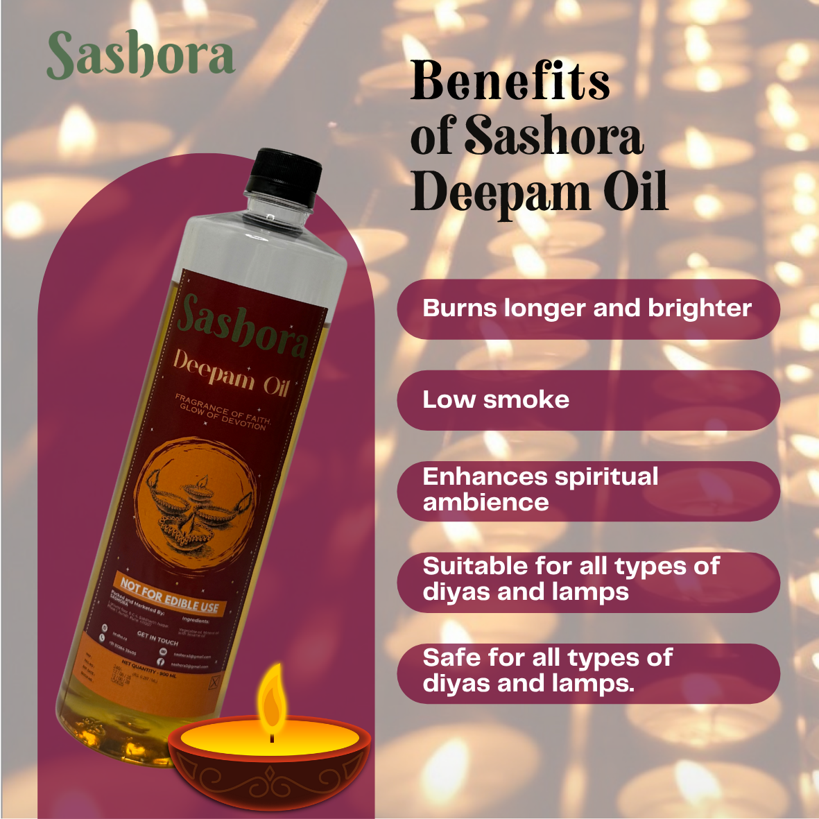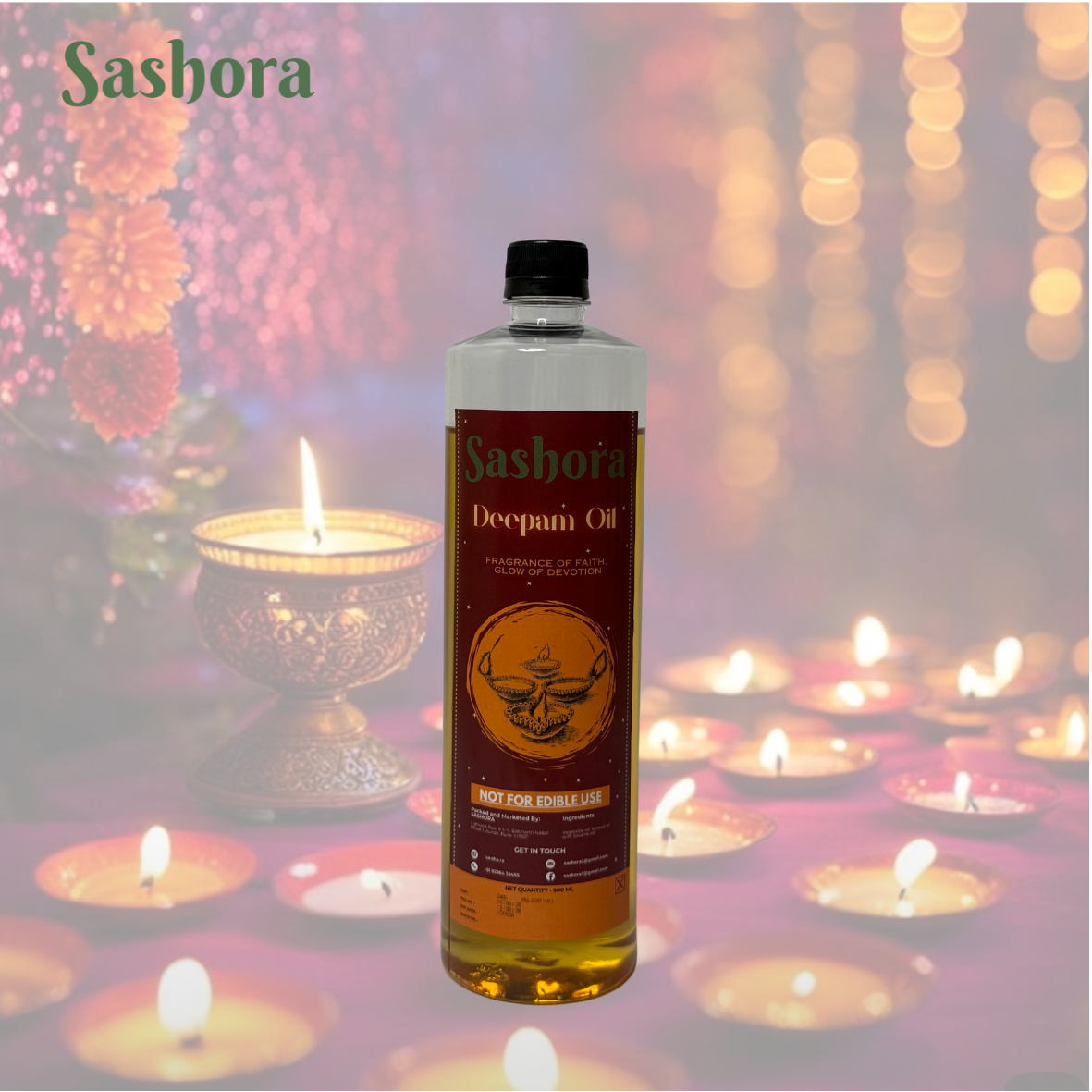 Bring divine warmth into your home with Sashora Deepam Oil — a sacred blend crafted for your daily puja and festive rituals. Made from high-quality oils, this lamp oil burns cleanly, steadily and brightly, creating a serene atmosphere filled with peace and positive energy.