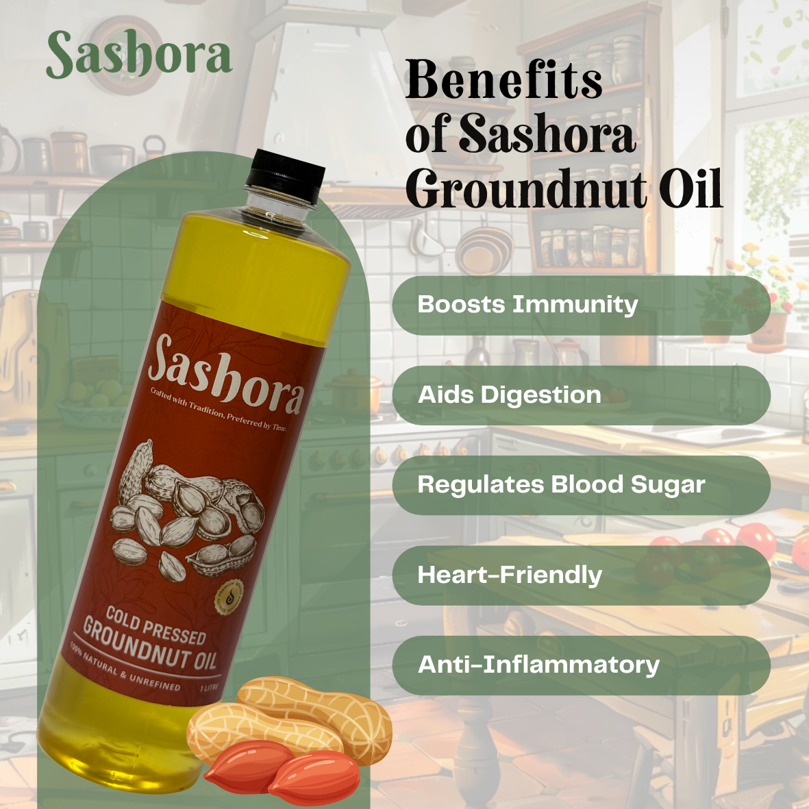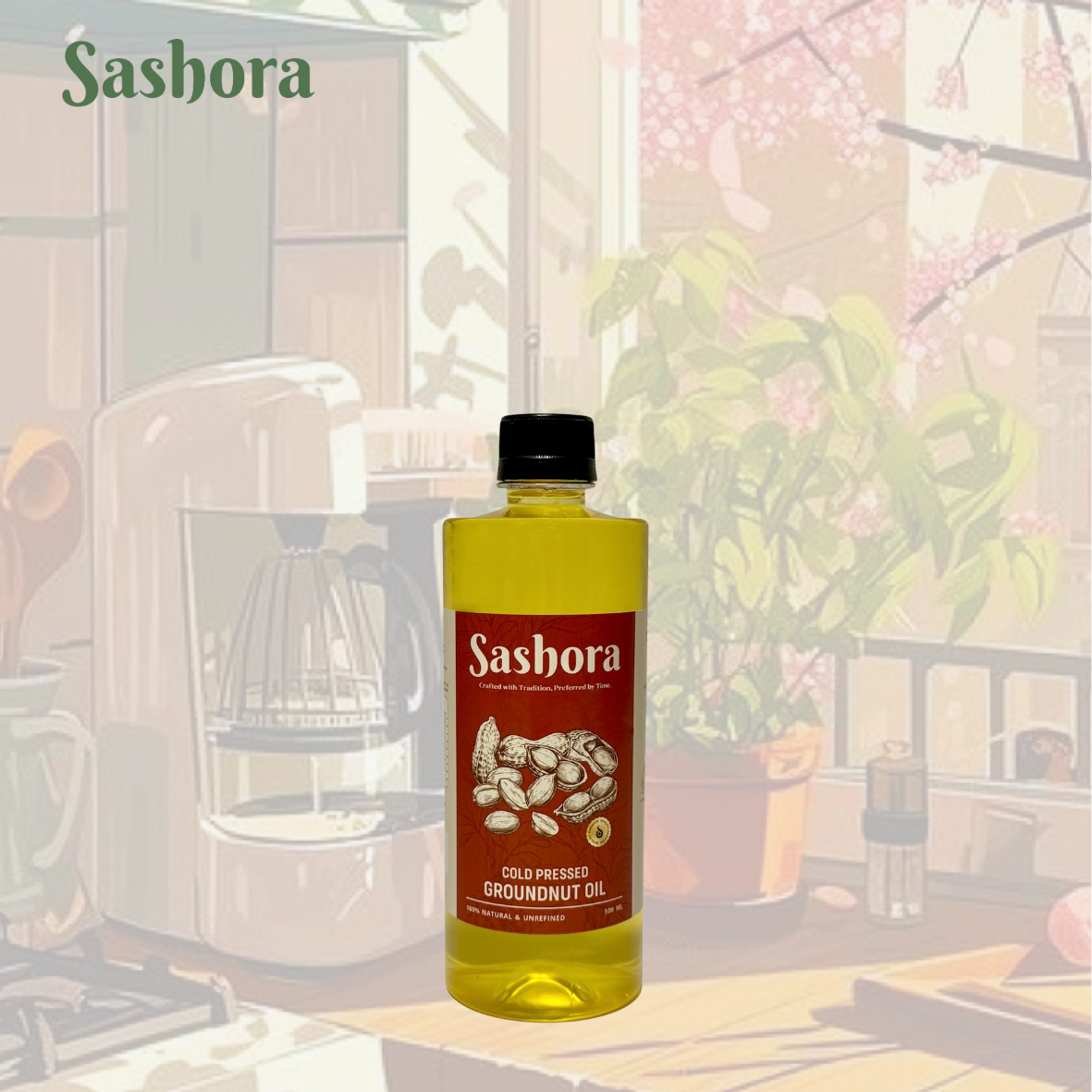 Experience the goodness of nature with our 100% pure SASHORA groundnut oil, made using traditional methods to preserve nutrients and enhance flavour. Extracted from premium-quality peanuts without heat or chemicals, our oil retains its natural aroma, essential fatty acids, and antioxidants, making it a perfect choice for your healthy lifestyle.