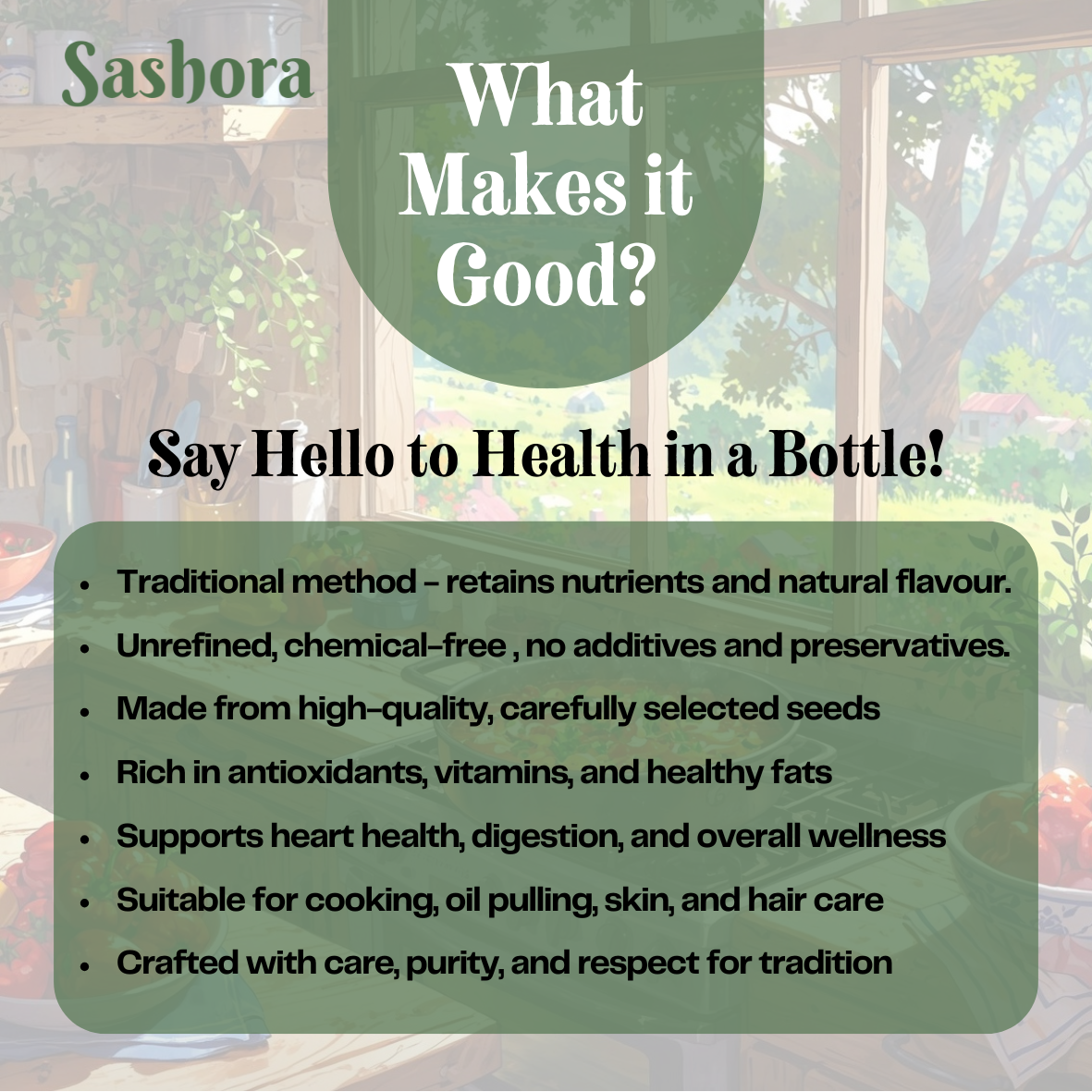 At Sashora, we don’t just make oil — we press purity, tradition and care into every drop. Our oils are made using the traditional method, ensuring that nutrients, aroma and natural goodness are preserved — without heat, chemicals or additives.